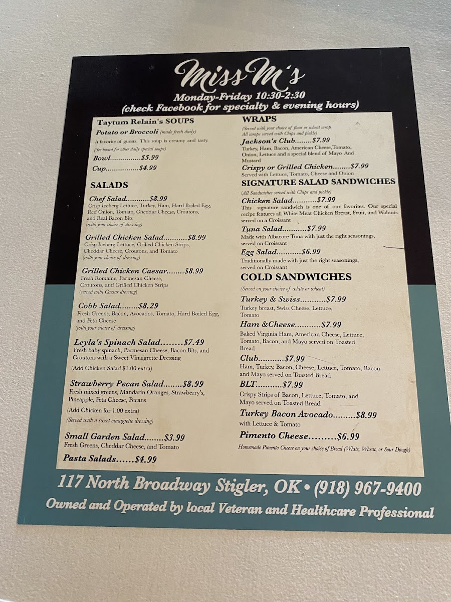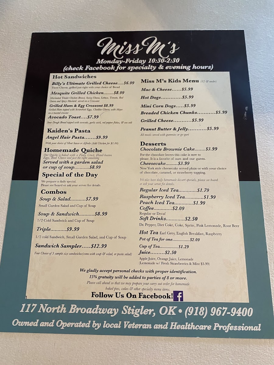 Miss M's Tea Room & Restaurant in Stigler, OK, offers a charming blend of American cuisine and classic tea house fare, perfect for a cozy lunch or special occasion. The menu shines with freshly prepared dishes like Billy's Ultimate Grilled Cheese and the savory Mesquite Grilled Chicken. For pasta lovers, the homemade quiche and daily specials add delightful variety and home-cooked warmth. The kid-friendly selection features comforting staples such as Mac & Cheese and Mini Corn Dogs, ensuring a welcoming experience for families.